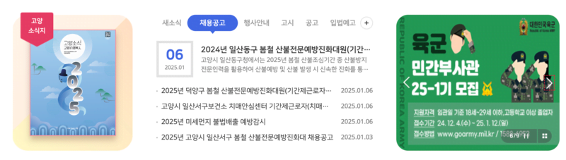 채용공고에는 일산동구 봄철 산불예방대원, 일산서구보건소 기간게근로자 채용 공고 등이 있습니다.
