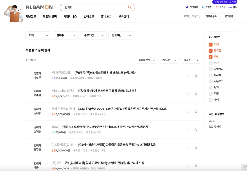 알바몬에서 김해시 검색 결과 김해 지역의 다양한 아르바이트를 확인할 수 있었습니다