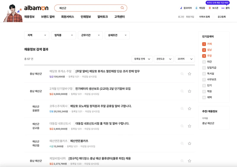 다음으로 알바천국에서 예산군 알바 정보를 찾아보겠습니다.