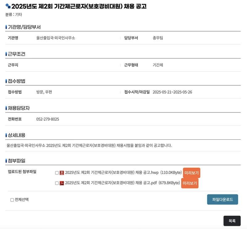 | 울산출입국·외국인사무소 | 2025년도 제2회 기간제근로자(보호경비대원) 채용 공고 | 기간제 | 방문, 우편 | 2025-05-26 |