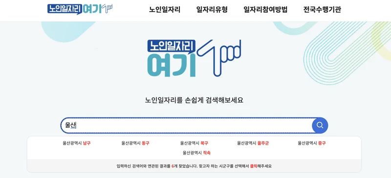 노인일자리여기 포털에 접속하면 상단 검색창에 '울산'을 입력하여 지역별 노인일자리를 검색할 수 있습니다. 울산광역시 남구, 북구, 중구, 동구, 울주군 등 원하는 지역을 선택하여 해당 지역의 노인일자리 정보를 확인할 수 있어요.
