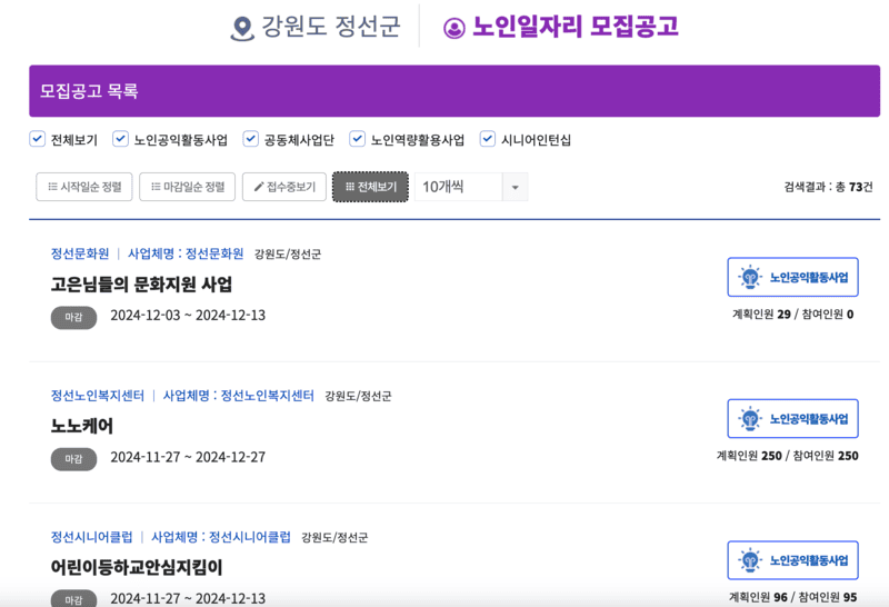 정선군 노인일자리 확인하기