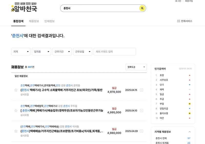 2025년 4월 현재 알바몬에서는 약 556건, 알바천국에서는 약 487건의 춘천 아르바이트 정보를 확인할 수 있었습니다.