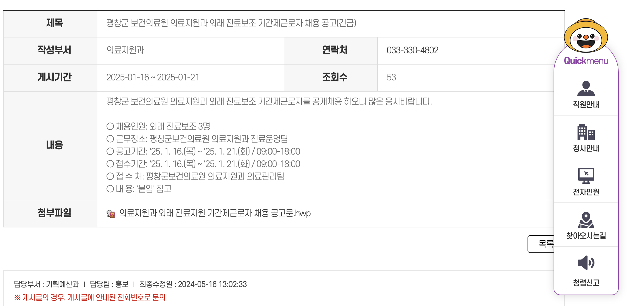 평창군 보건의료원 긴급채용 공고가 있네요. 접수기간이 얼마 안남았는데, 첨부파일 HWP를 확인하면 자세한 절차를 확인하실 수 있어요.