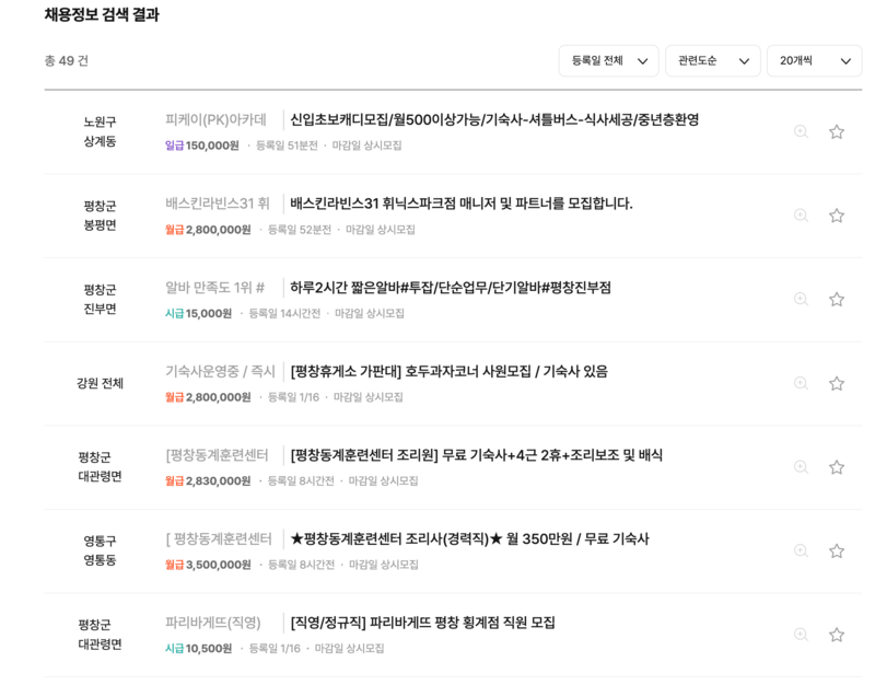 다음으로 알바천국에서 평창군 알바 정보를 찾아보겠습니다.